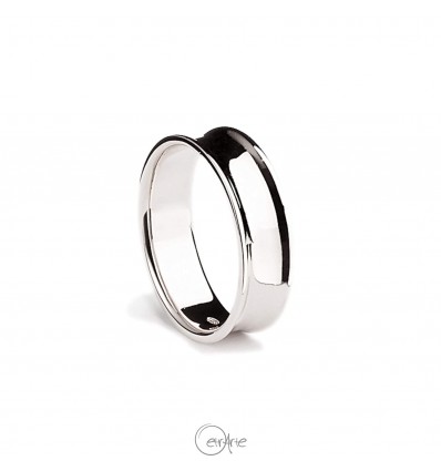 Anello nuziale dalla forma cancava con i bordi rialzati e dalla superficie liscia. Finitura lucida. Un anello semplice dal design minimal e moderno.