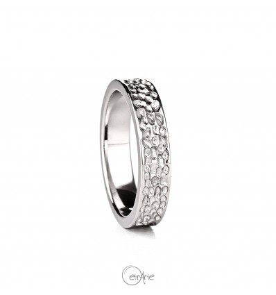 Anello tondo dalla finitura martellata molto fitta che ricorda la superficie lunare. Un anello romantico e dal design unico.
