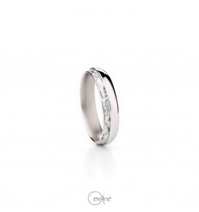 Anello tondo realizzato in oro con superficie esterna alternata liscia e texture effetto roccia. Interno sabbiato con vestibilità comoda. Larghezza 4,5 mm.